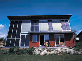 Mit den Kollektoren, die an diesem Gebäude in die Fassade integriert sind, wird ein zwei Kubikmeter großer Wasserspeicher aufgeheizt, dessen Nachheizung ebenfalls regenerativ durch einen Holzvergaser-kessel erfolgt.